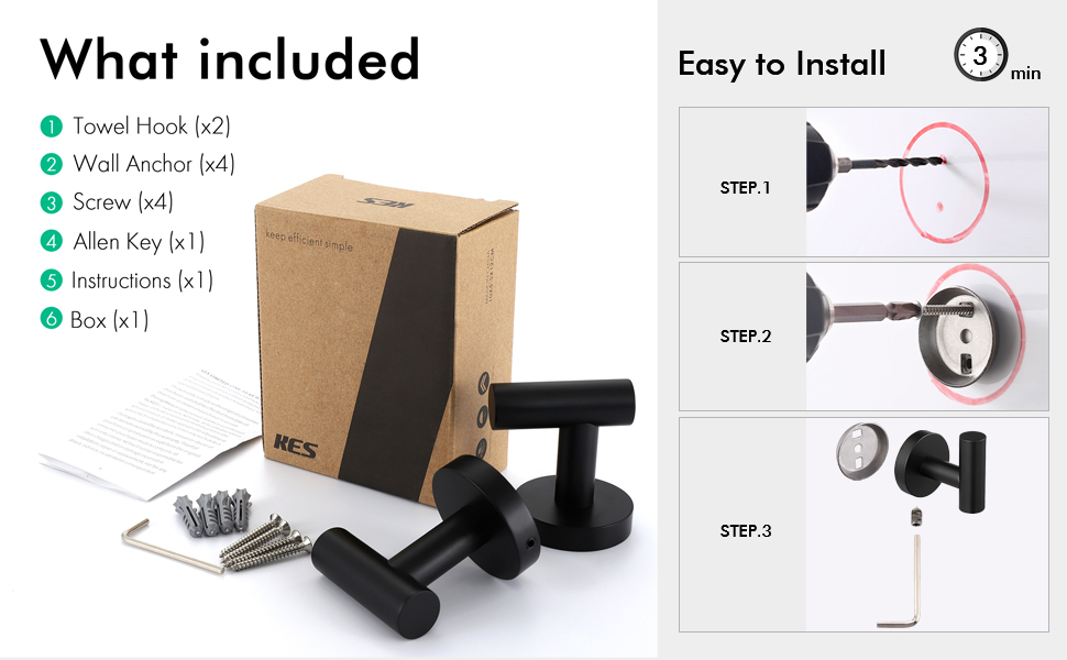 ACCESSORIES INCLUDED: 2 x Towel Hook, Screws Pack, Installation Instruction. You can install the towel hook right away after you receive the package.