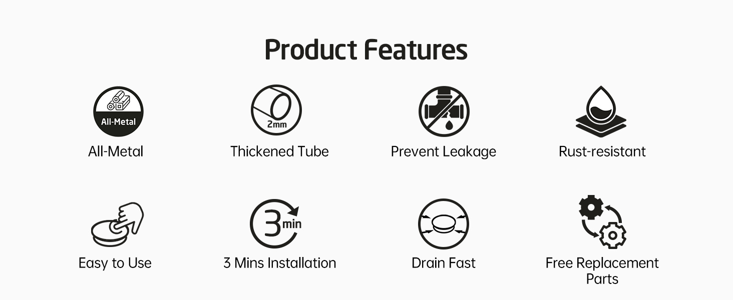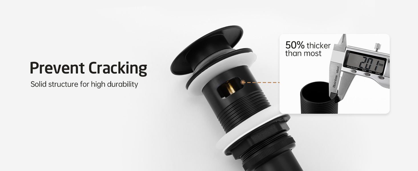 Solid Metal Construction: Composed of explosion-proof, crack-resistant and thickened brass and type 304 premium grade stainless steel, our sink drain is an integrated body with a 0.4mm thickness pipe wall to avoid water leakage when tightening.
