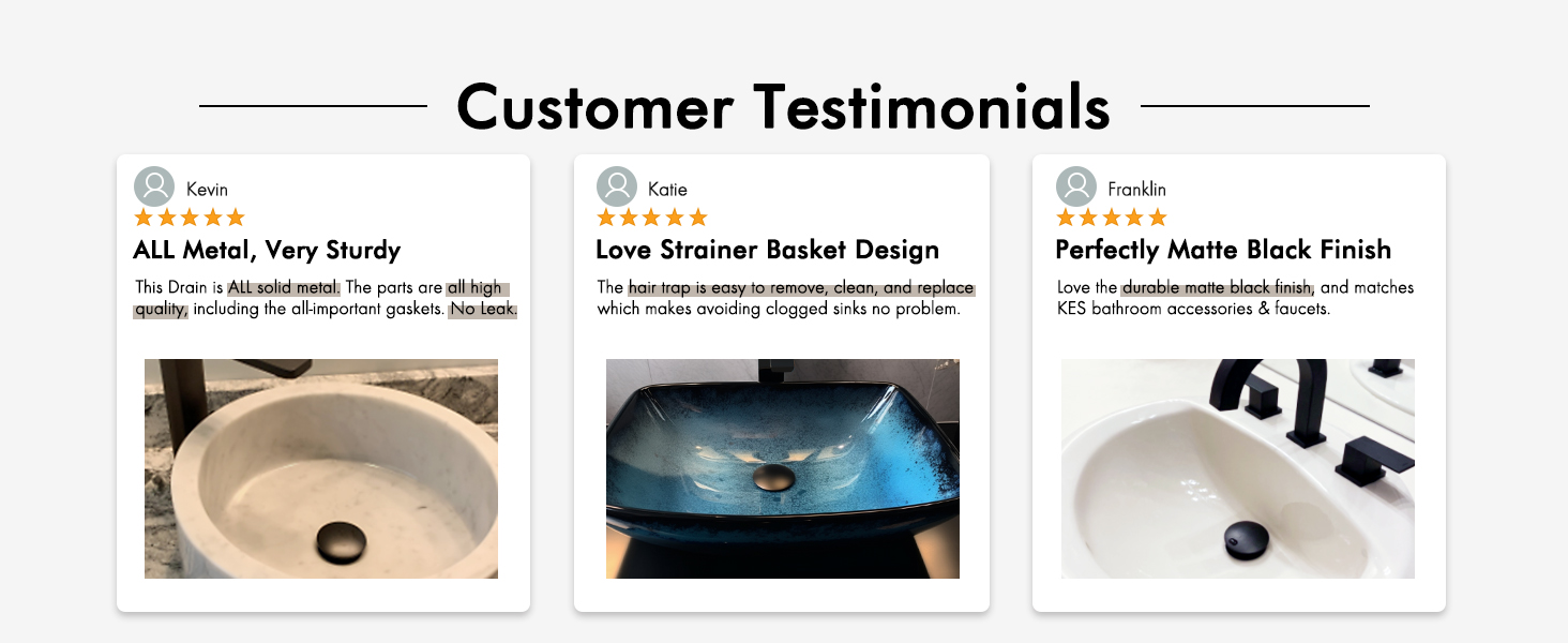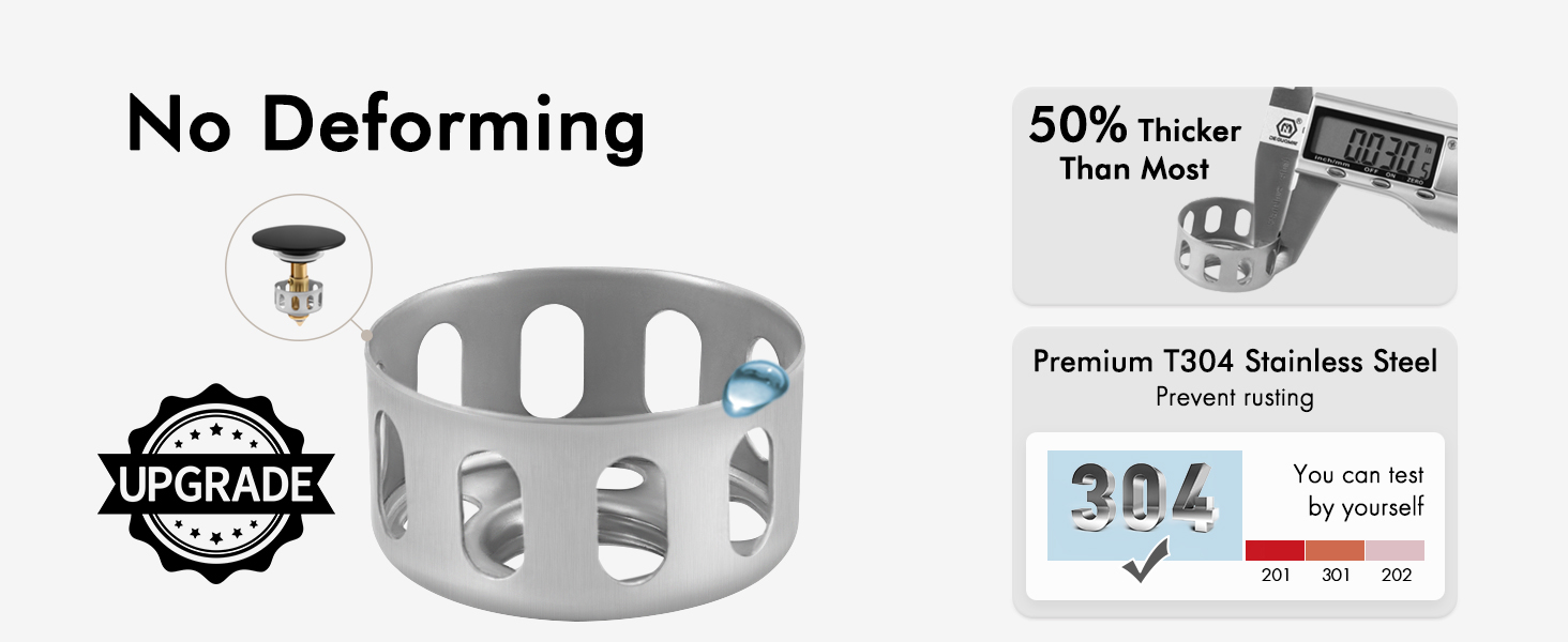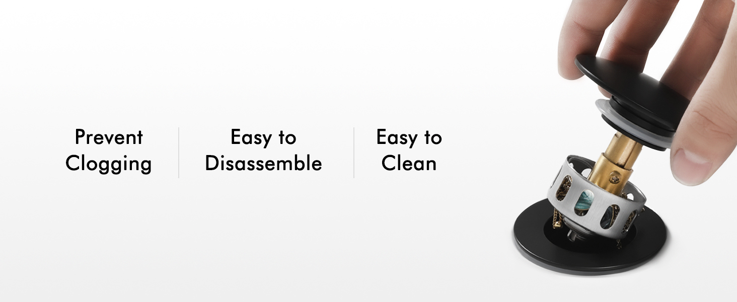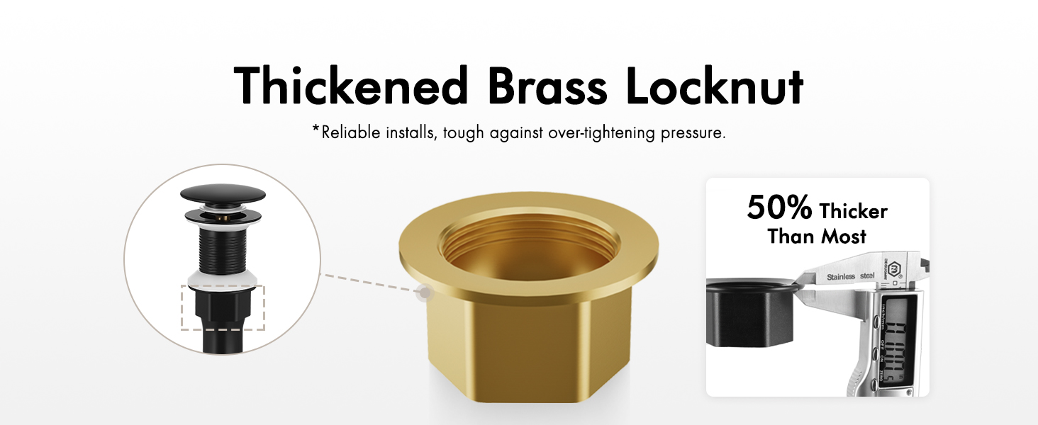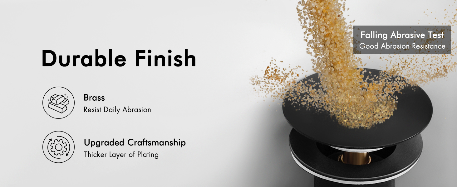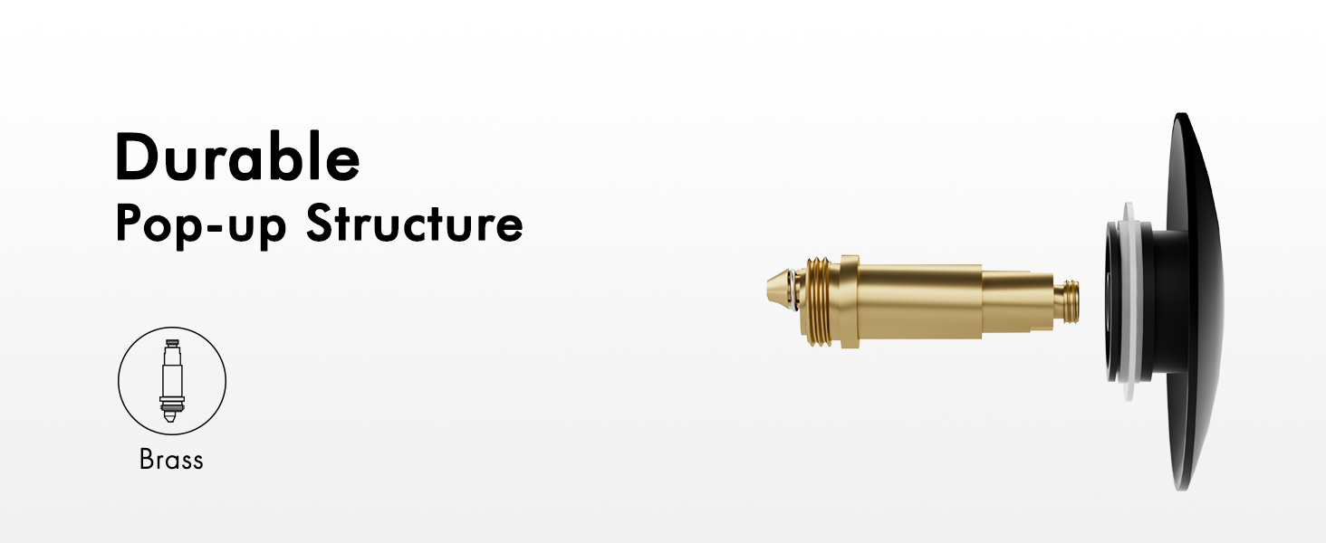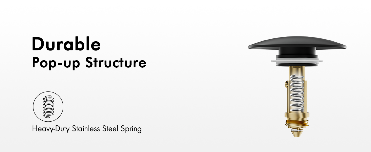 [Sturdy] With a brass pop-up bolt and stainless steel spring, our black sink drain surpasses U.S. standards by passing a lifespan test of over 15,000 open-close cycles.