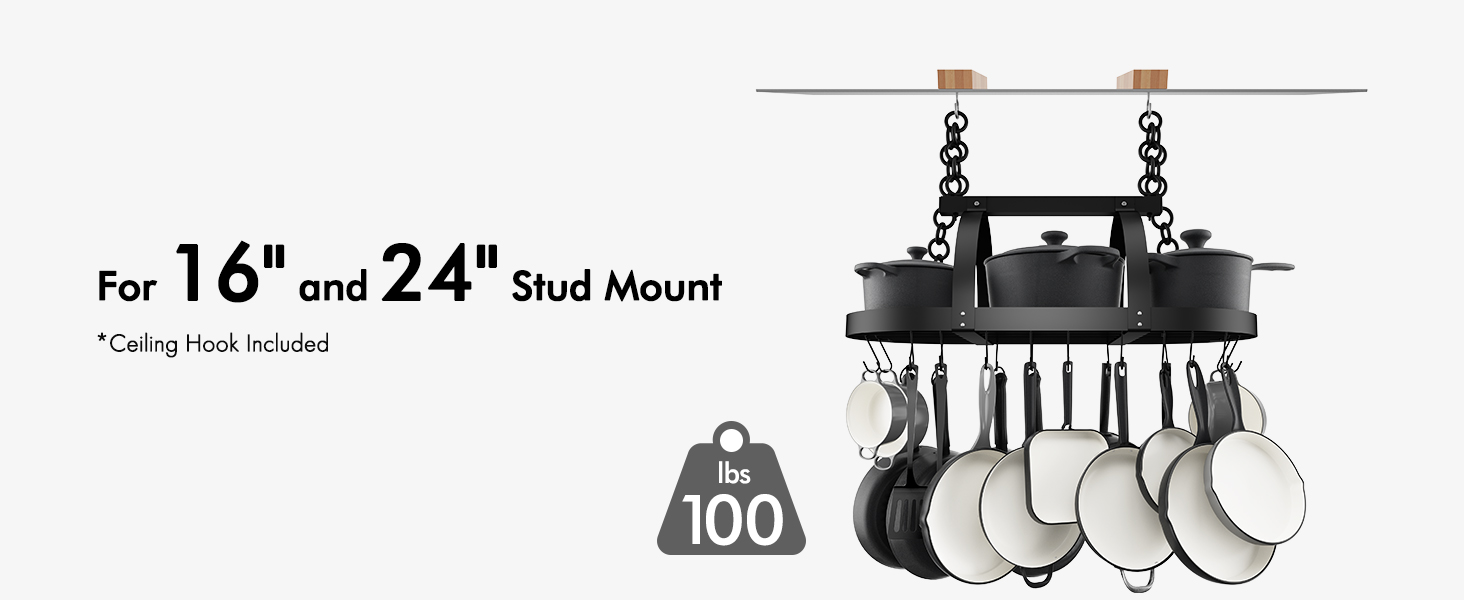 [ 16″ and 24″ Stud Installation for 100lbs Load ] KES pot hanger can support a whopping 100lbs. The 20 included hooks offer even more kitchen-organized storage for cast iron pots and pans, freeing up valuable kitchen space.