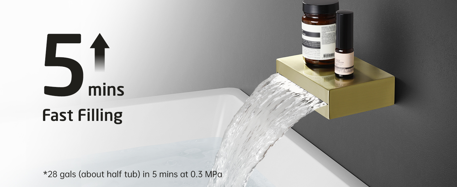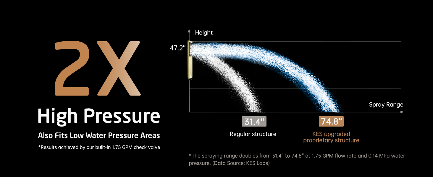 [ Double the Spray Range Even in Low-pressure Areas ] KES gold shower faucet set has designed a proprietary structure that when compared to a regular hand shower, doubles the water spray range from 31.4″ to 74.8″ at 1.75 GPM and 0.14 MPa. (Data Resource: KES Labs)