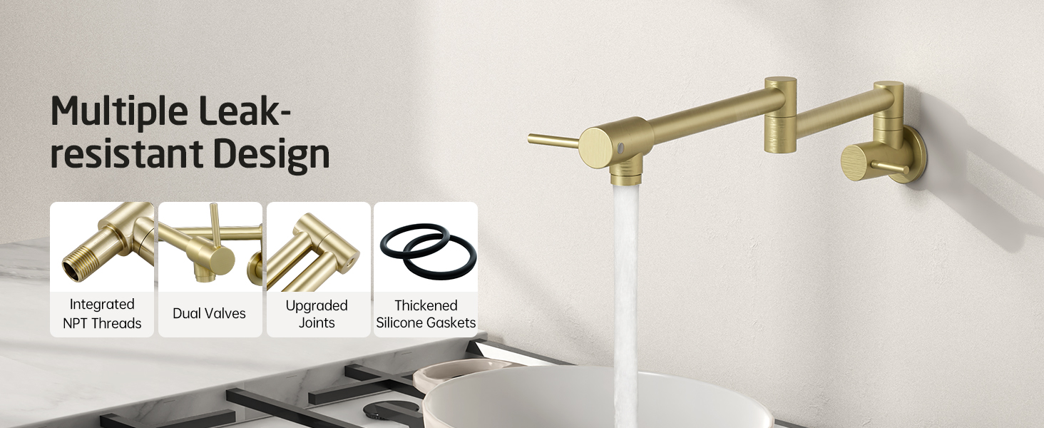Dual Valves & Articulating Arms: This brass pot filler features the convenience of two valve controls and an articulated arm that has a maximum reach of 17 inches. Plus, it folds out of the way when not in use, which saves kitchen space. The 360°rotating design makes it easy to fill large cooking vessels quickly without having to walk from the sink to the stove. (Just remember to turn off both valves after use.)