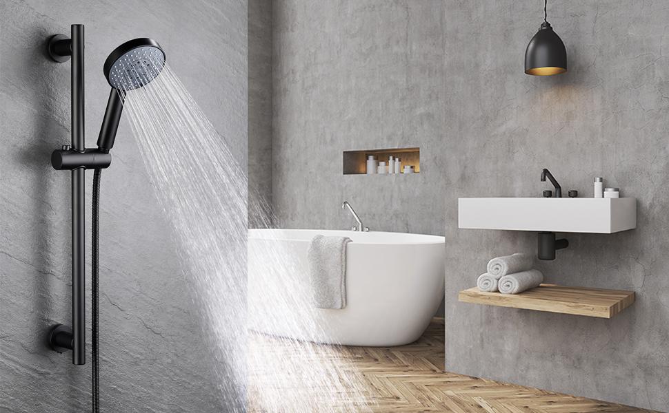 Package Included: The package comes from a 5-function handheld showerhead, a 59″ (1.5m) double interlock spiral hose, a sliding bar, a shower holder, a hardware pack, and a detailed installation guide. Note: The flow rate of the aerator that is pre-installed in the showerhead is 1.8 GPM (6.8 L/min) at 80 PSI, which is compliant with California water efficiency regulations.