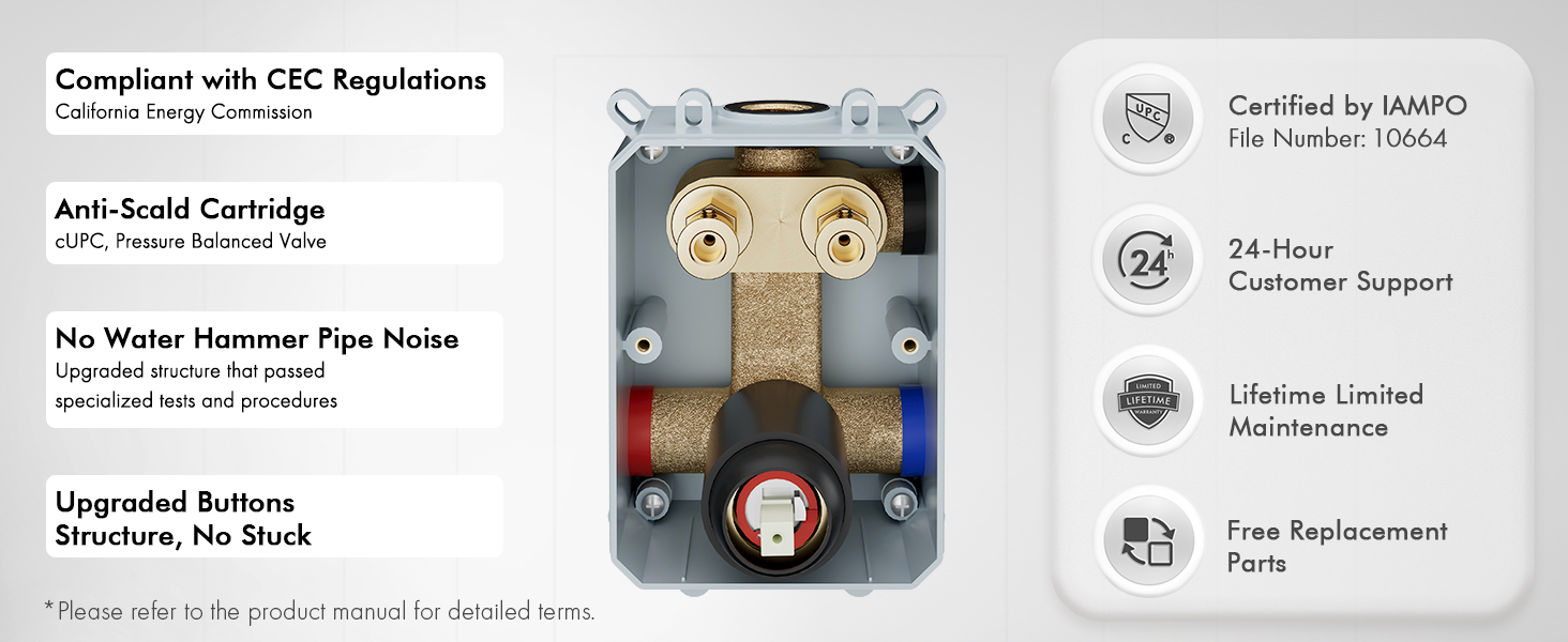 Anti-Scald: Pressure-balanced valve prevents water pressure fluctuations, so the shower water temperature will be constant and not change suddenly even when the toilet is flushed or other appliances are utilized with water.