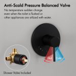 Anti-Scald: Pressure-balanced valve prevents water pressure fluctuations, so the shower water temperature will be constant and not change suddenly even when the toilet is flushed or other appliances are utilized with water.