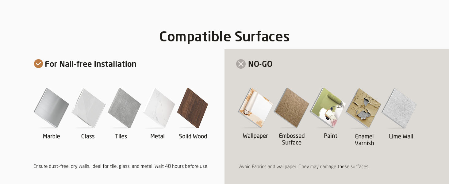 [No Drilling & Reinstall – No Damage to Wall] No need for drills or screws during installation. Attach the adhesive pad to a smooth wall and secure the bracket without wall damage. An extra adhesive pad is included to readjust the bracket’s position according to your needs. During installation, please check the larger opening faces upward.