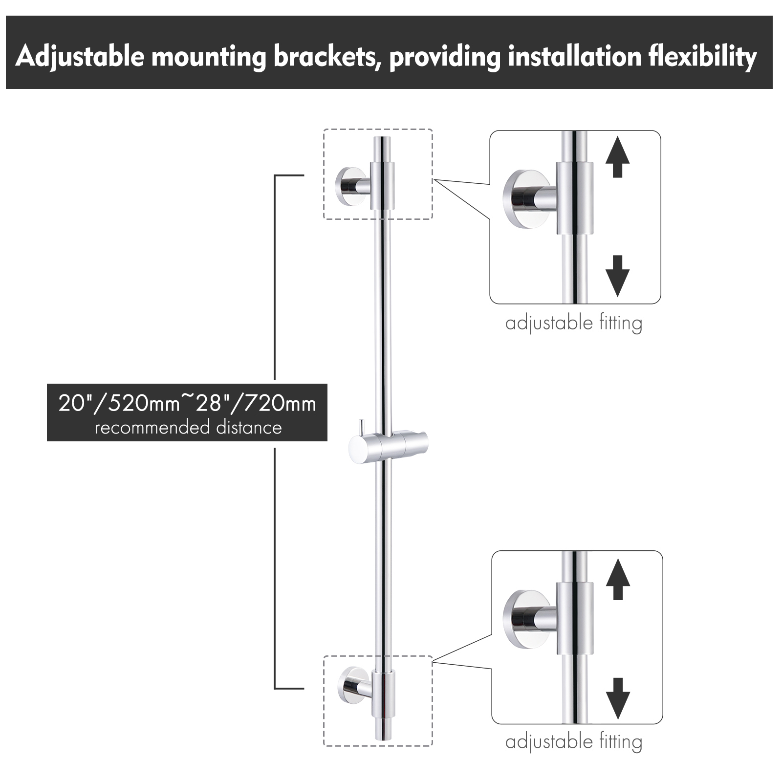 Adjustable Brackets – Cover Existing Holes: KES shower bar features two adjustable brackets, which provide easy alignment with the existing drill holes, or can be attached to the grout line without damaging tiles. The adjustable distance between the two brackets is 20.5″ (520 mm) to 28.4″ (720 mm) so there is plenty of space to adjust the mounting position as needed. Note: The slide bar is not a one-piece structure so it should be assembled.