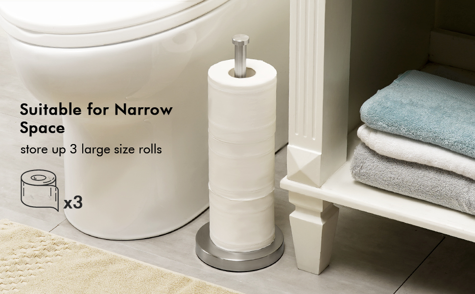Space Saving: Overall height: 15.3″ (390mm). This toilet paper holder can store up to 3 mega-sized rolls of toilet tissue, helping to save space of your bathroom cabinet. The toilet paper storage stand keeps an ample supply of rolls within your arms’ reach and frees up your cabinet storage. This freestanding tissue holder takes up a little space and can be easily placed near the toilet.