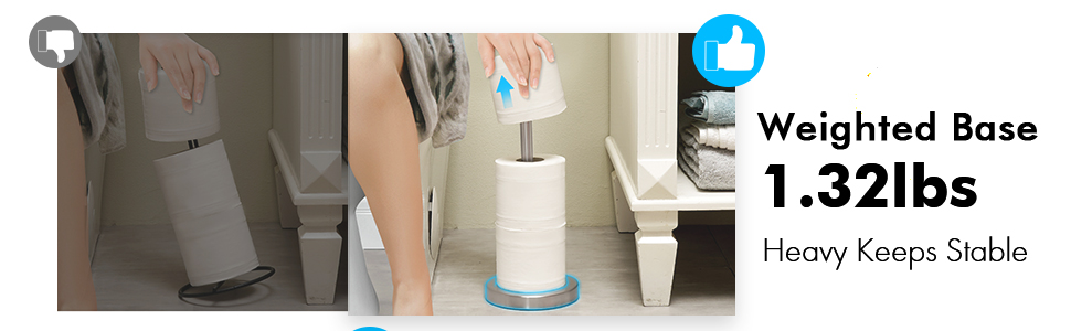 Heavy Base – Not Easy to Tip Over: This freestanding toilet paper holder is equipped with a heavy-duty base (1.3 lbs) that is heavier and more sturdy than similar products with acrylic bases and keeps stable without being knocked over. Also, the sprayed surface of our toilet paper holder performs better in resisting scratches and corrosions than those with acrylic bases, so it can serve you for a longer time.