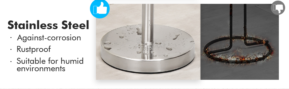 Rustproof: This toilet paper holder stand is made of premium-grade SUS304 stainless steel to protect against corrosion and rust. It’s suitable for humid environments such as bathrooms.
